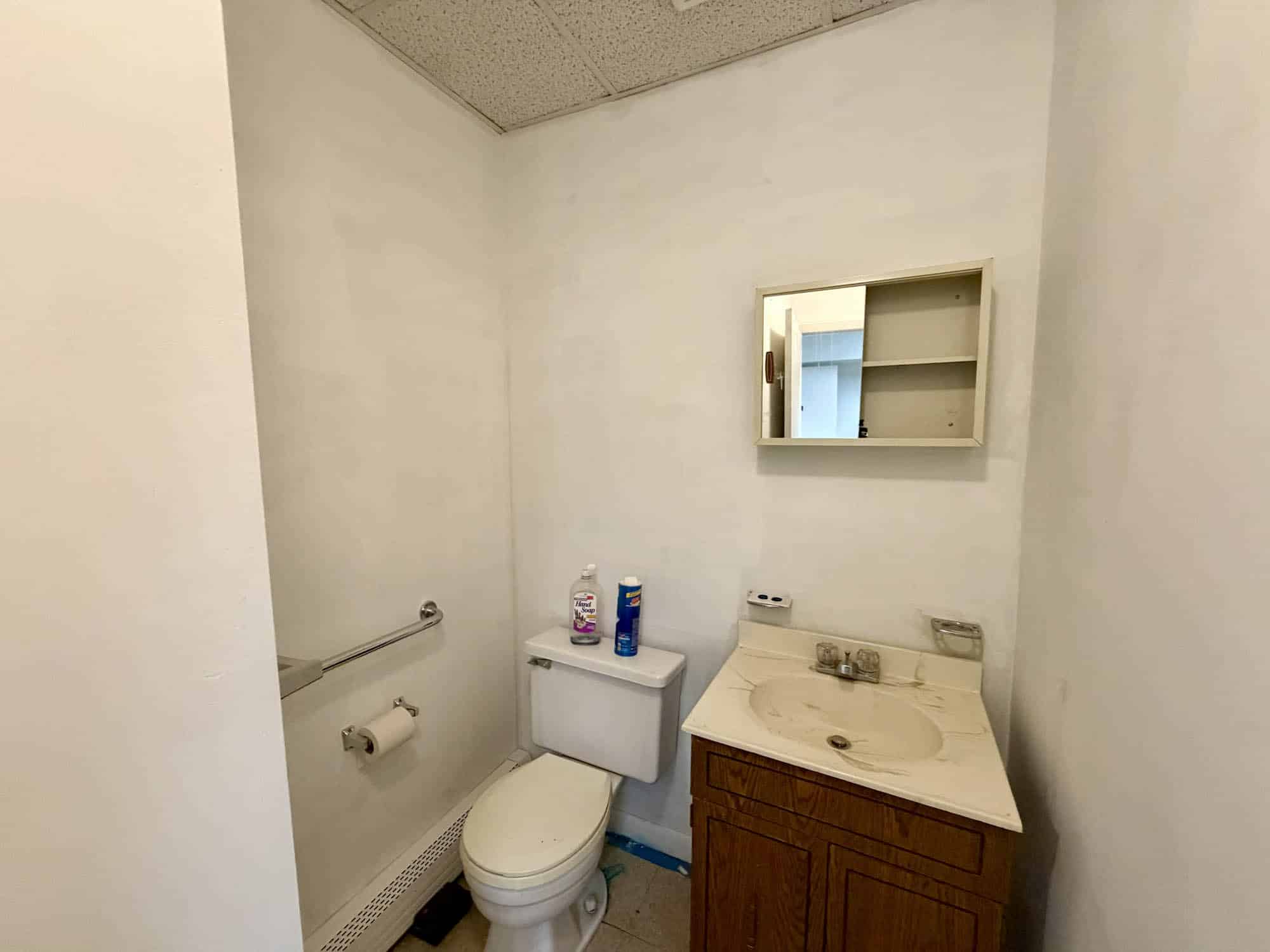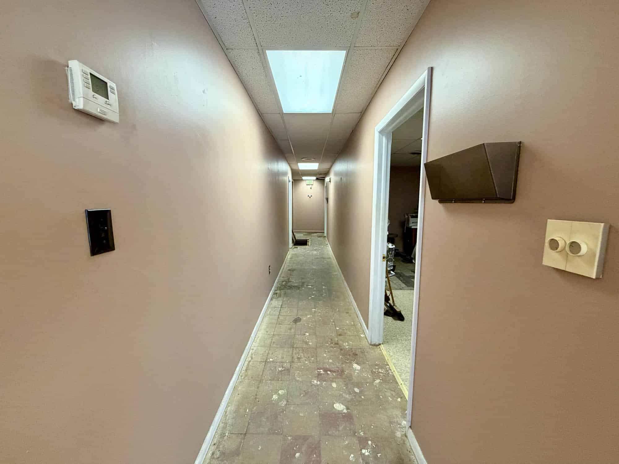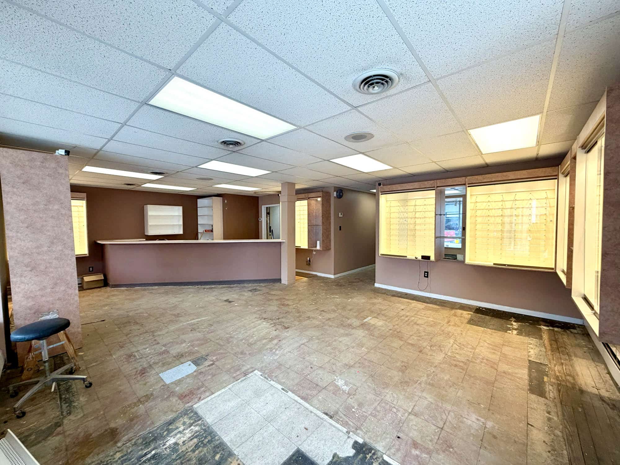 Storefront – Retail showroom area, two private offices, utility area, two powder rooms. Interior finishes are subfloor, drop ceiling and drywall. Gas forced air heat and CAC (2019). Needs renovation.