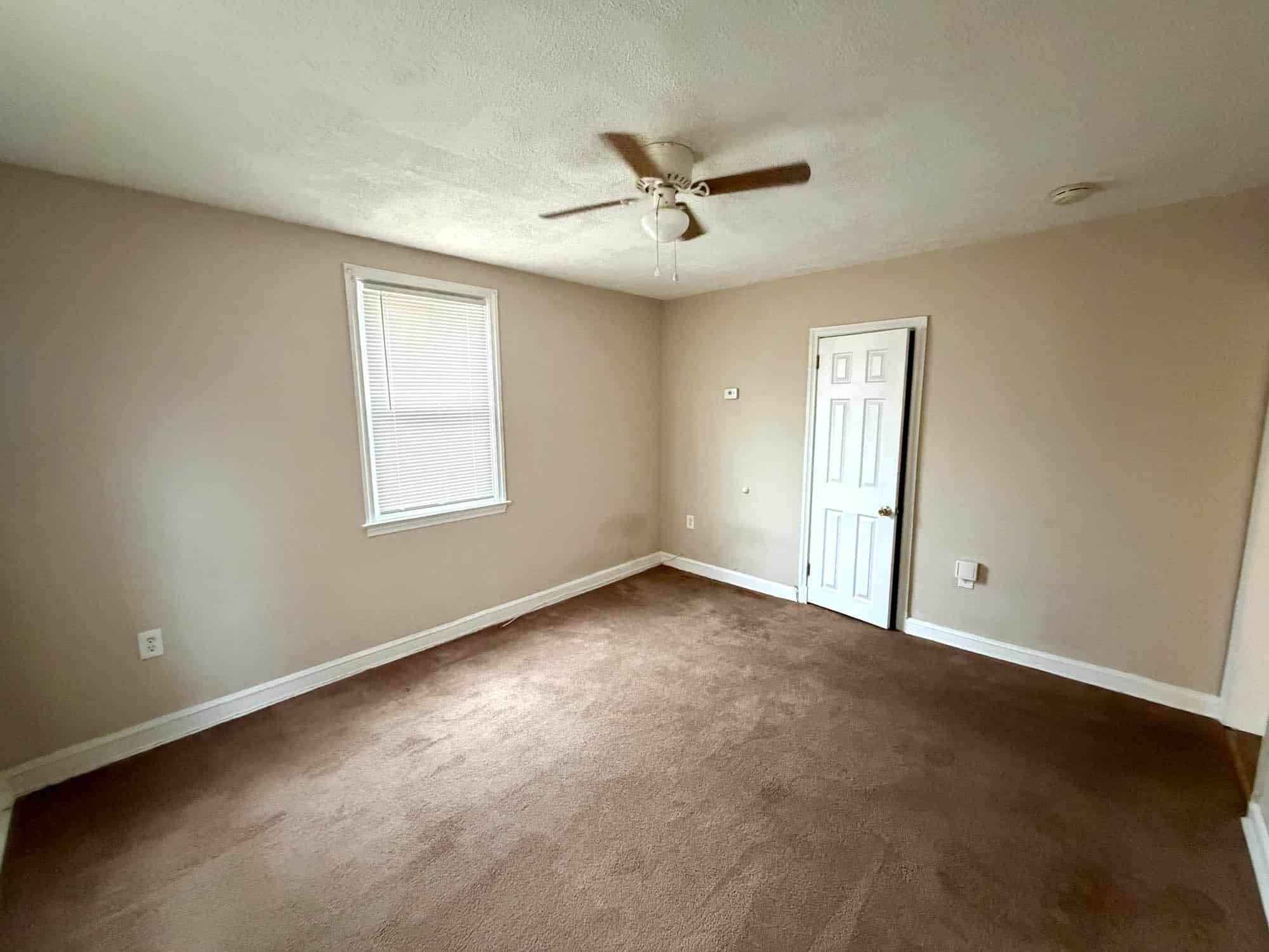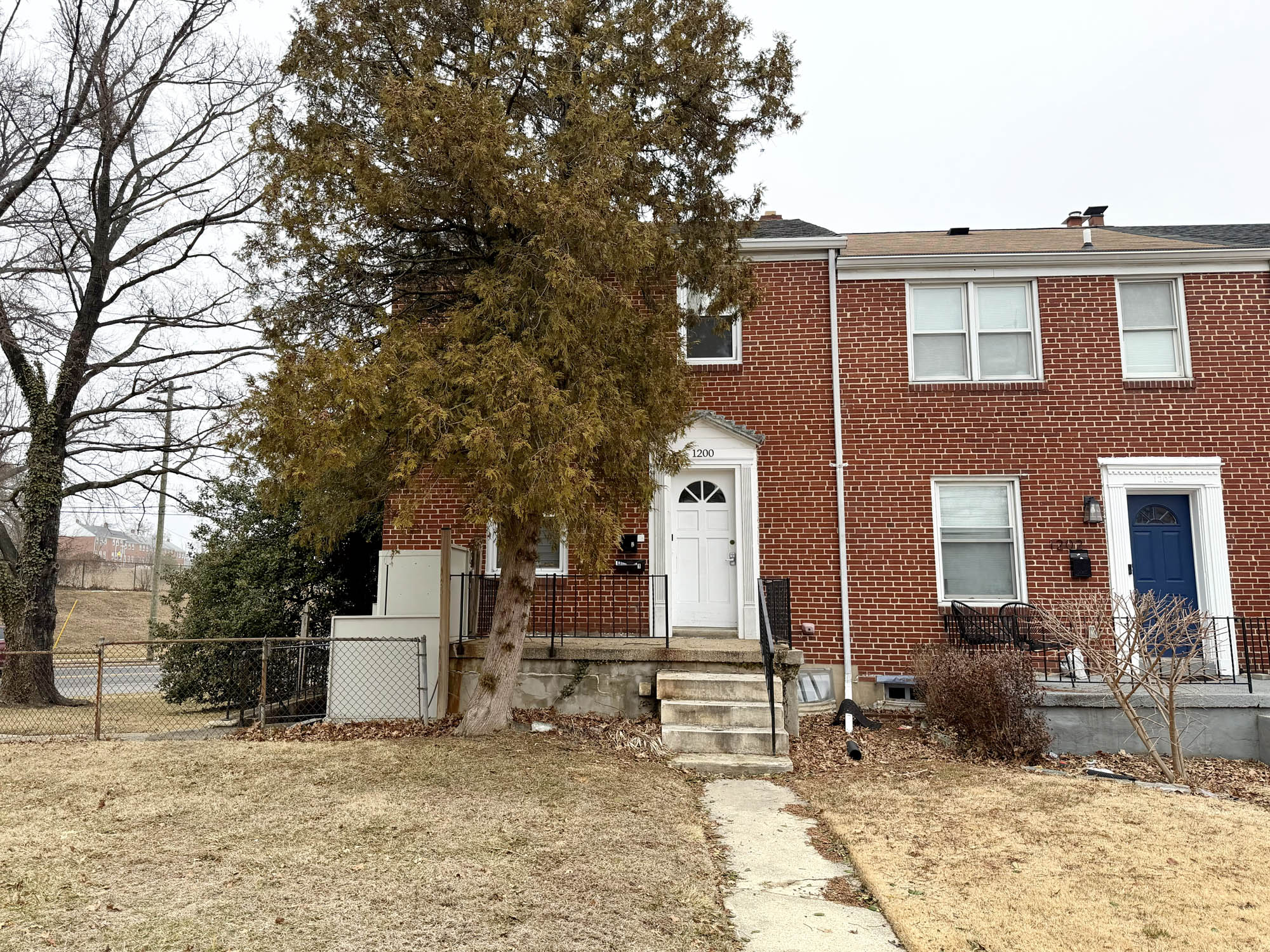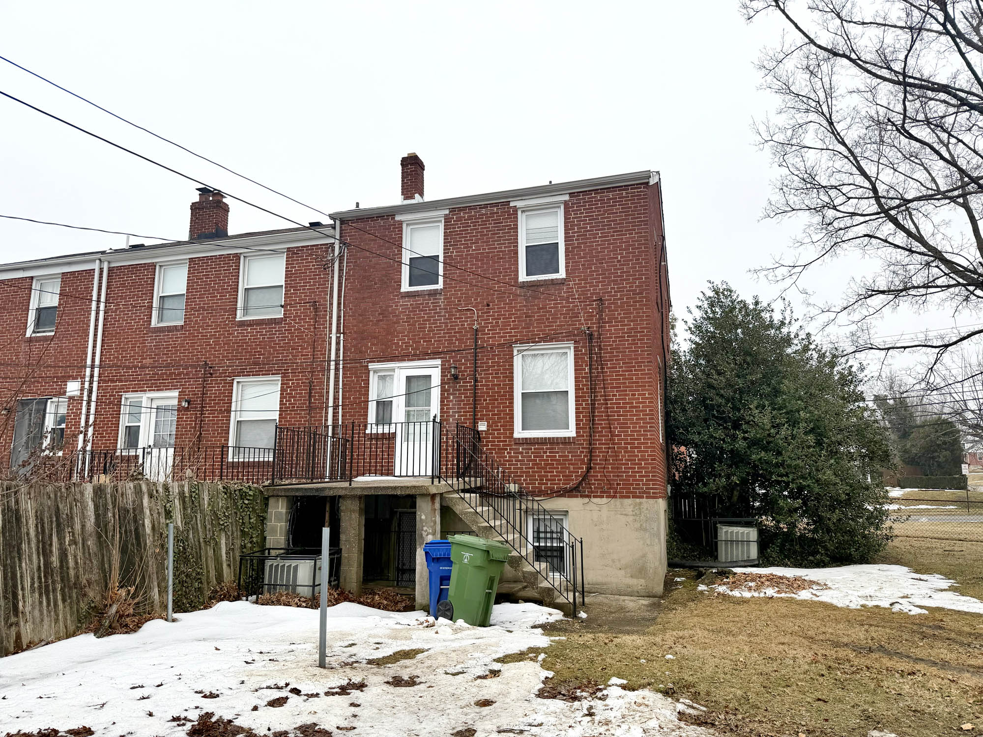 Two story end-of-group porchfront brick townhome arranged for 2 dwelling units – constructed in 1951, containing 1,064 square feet of above grade and 532 square feet of basement space. Exterior features include concrete block foundation, brick facade, asphalt shingle roof, and vinyl clad replacement windows.
