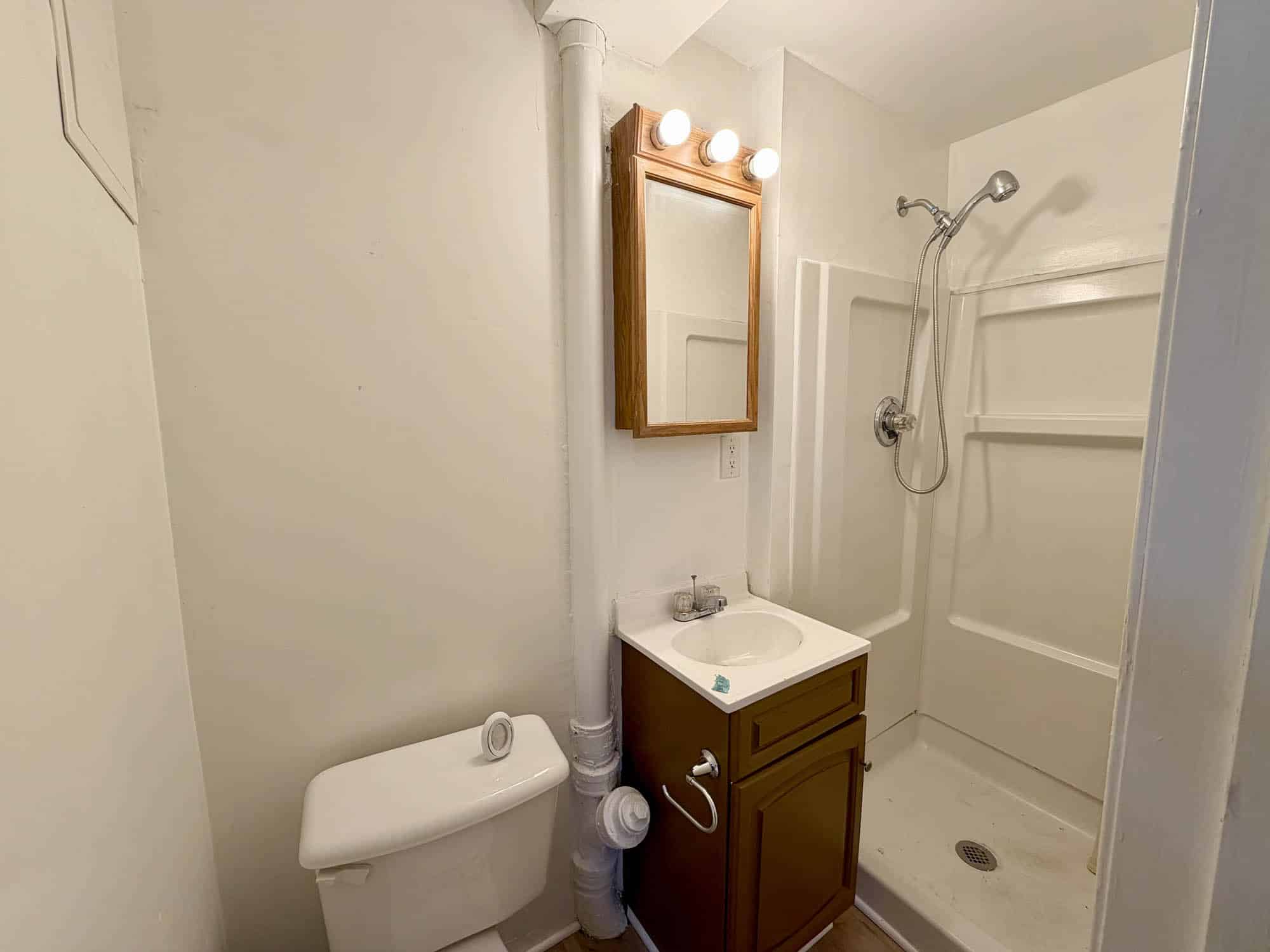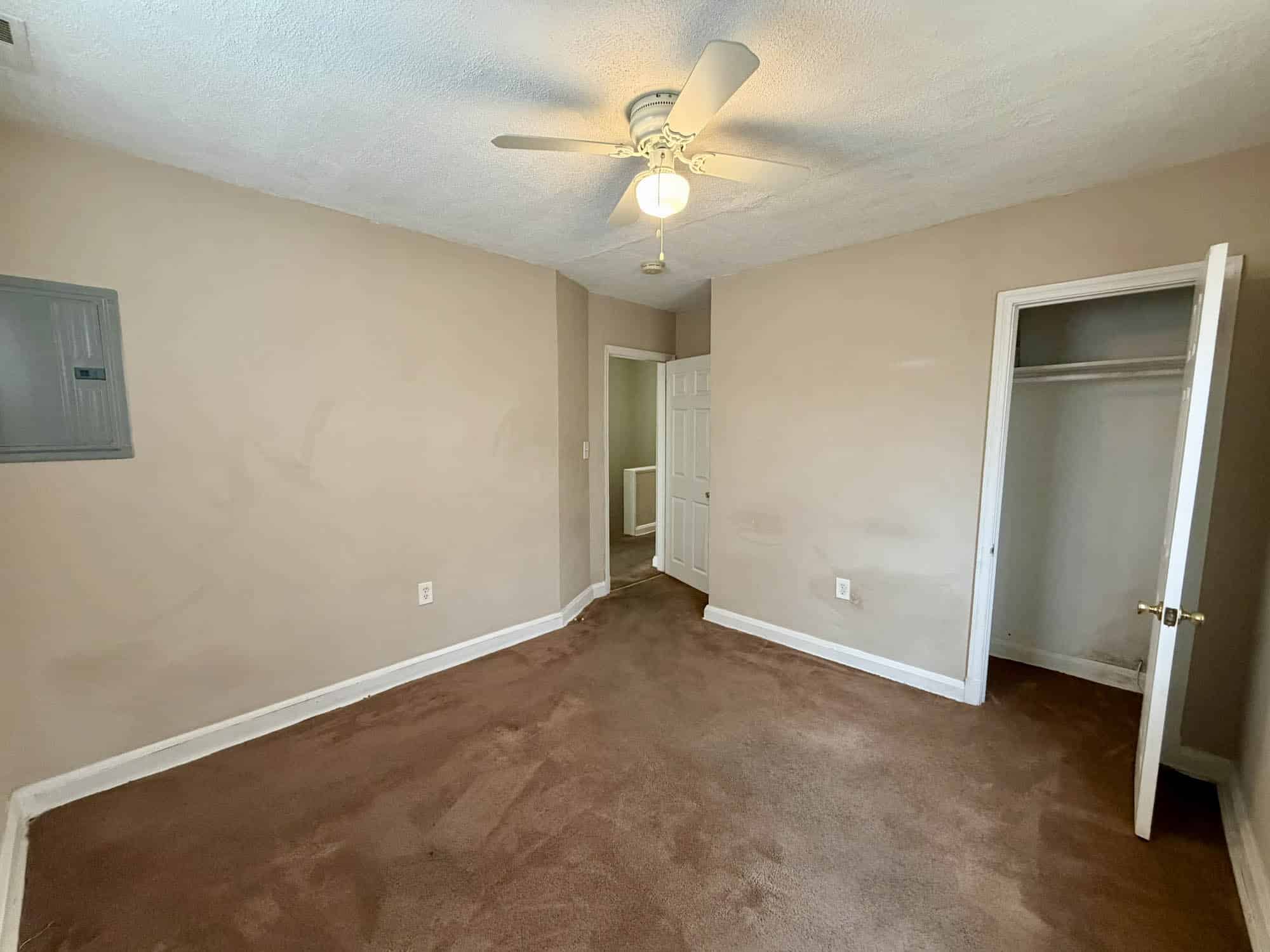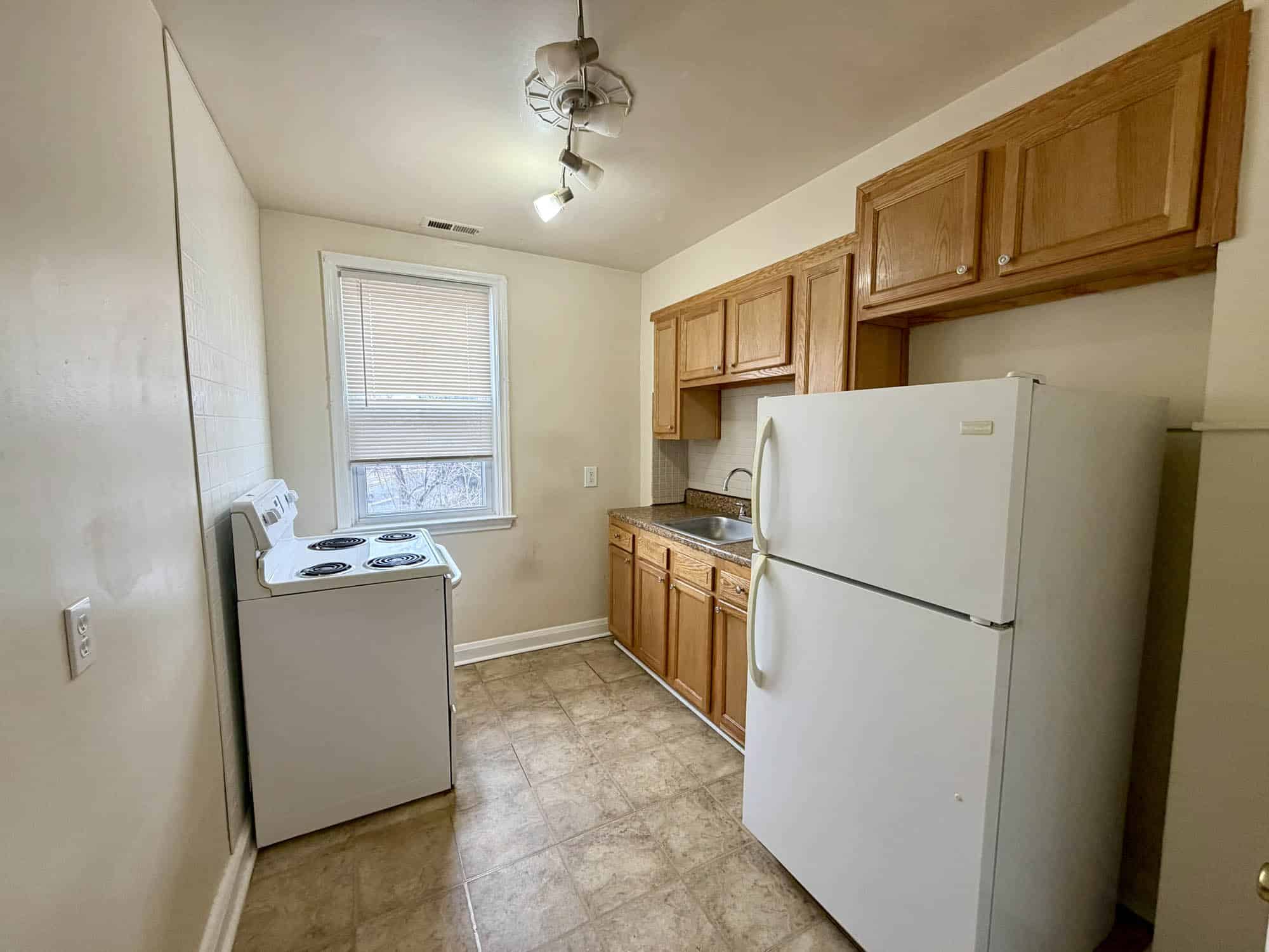 Two story end-of-group porchfront brick townhome arranged for 2 dwelling units – constructed in 1951, containing 1,064 square feet of above grade and 532 square feet of basement space. Exterior features include concrete block foundation, brick facade, asphalt shingle roof, and vinyl clad replacement windows.
