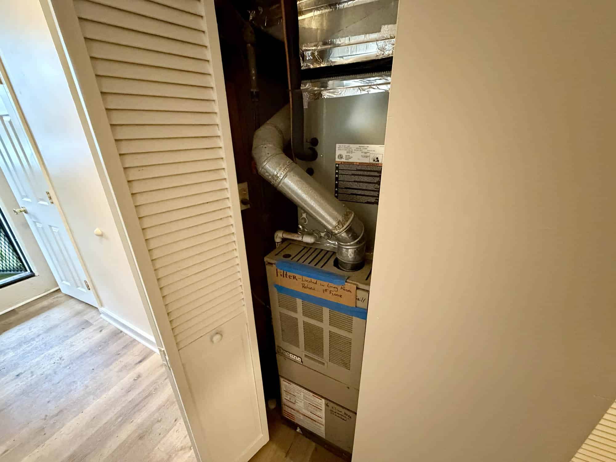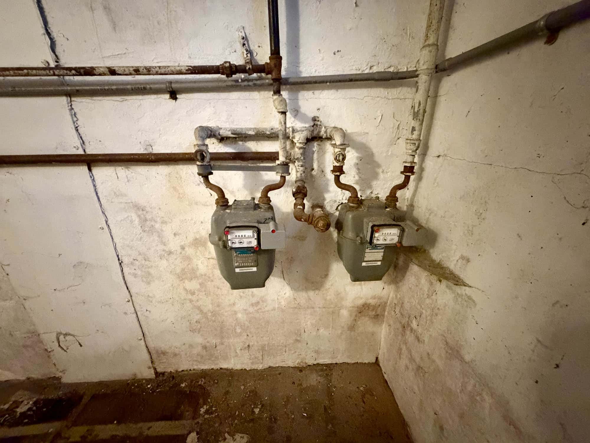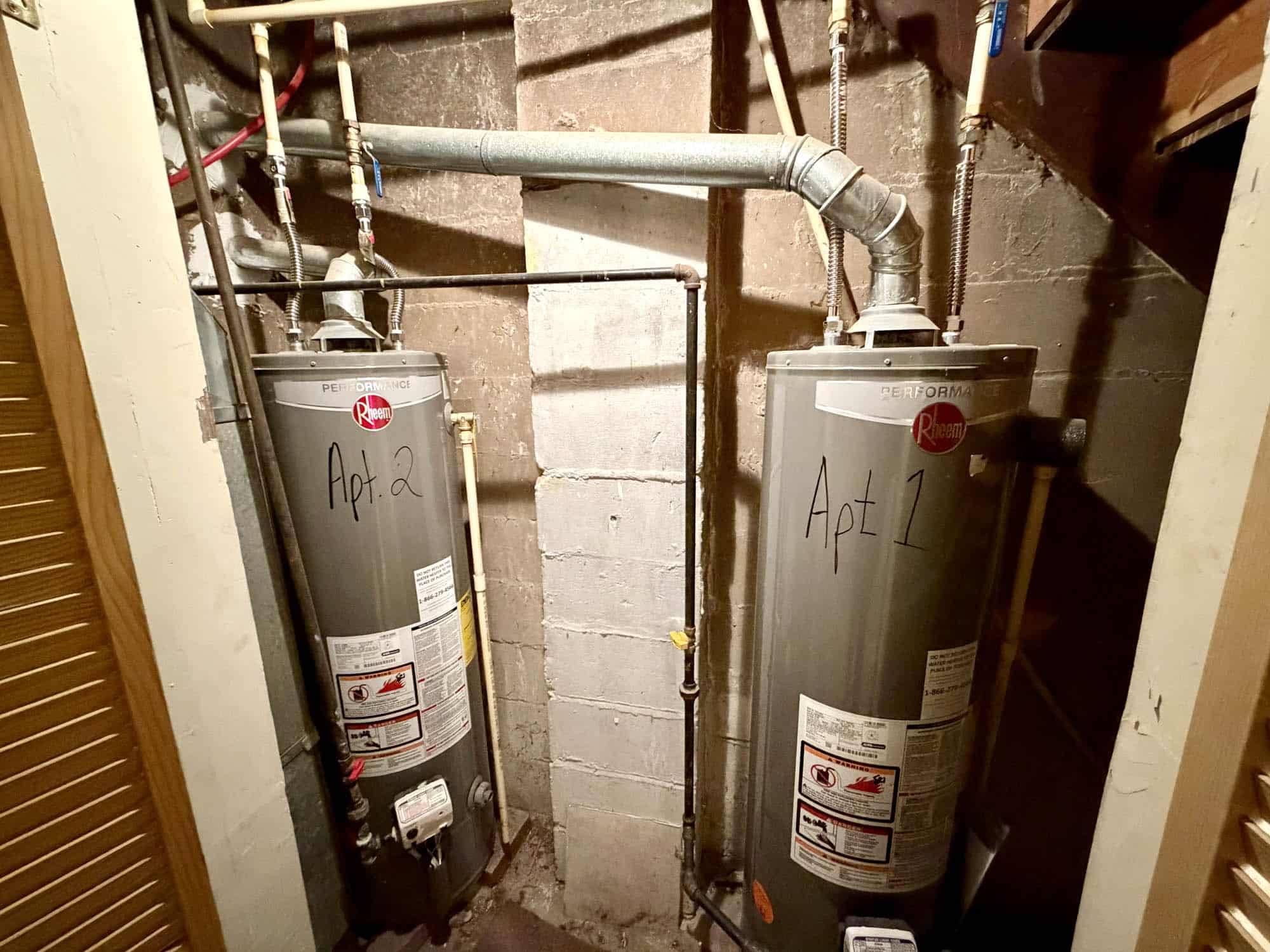 Two gas meters, two electric meters, two 100 amp electrical panels, two 29 gallon gas water heaters, two gas furnaces, and two central air conditioning units.