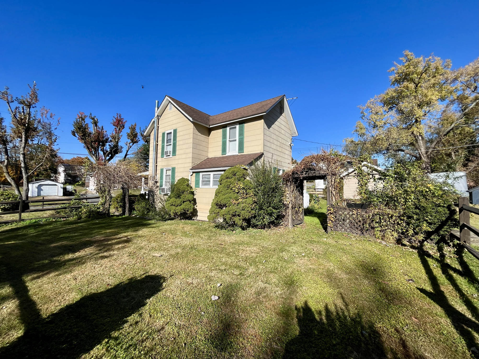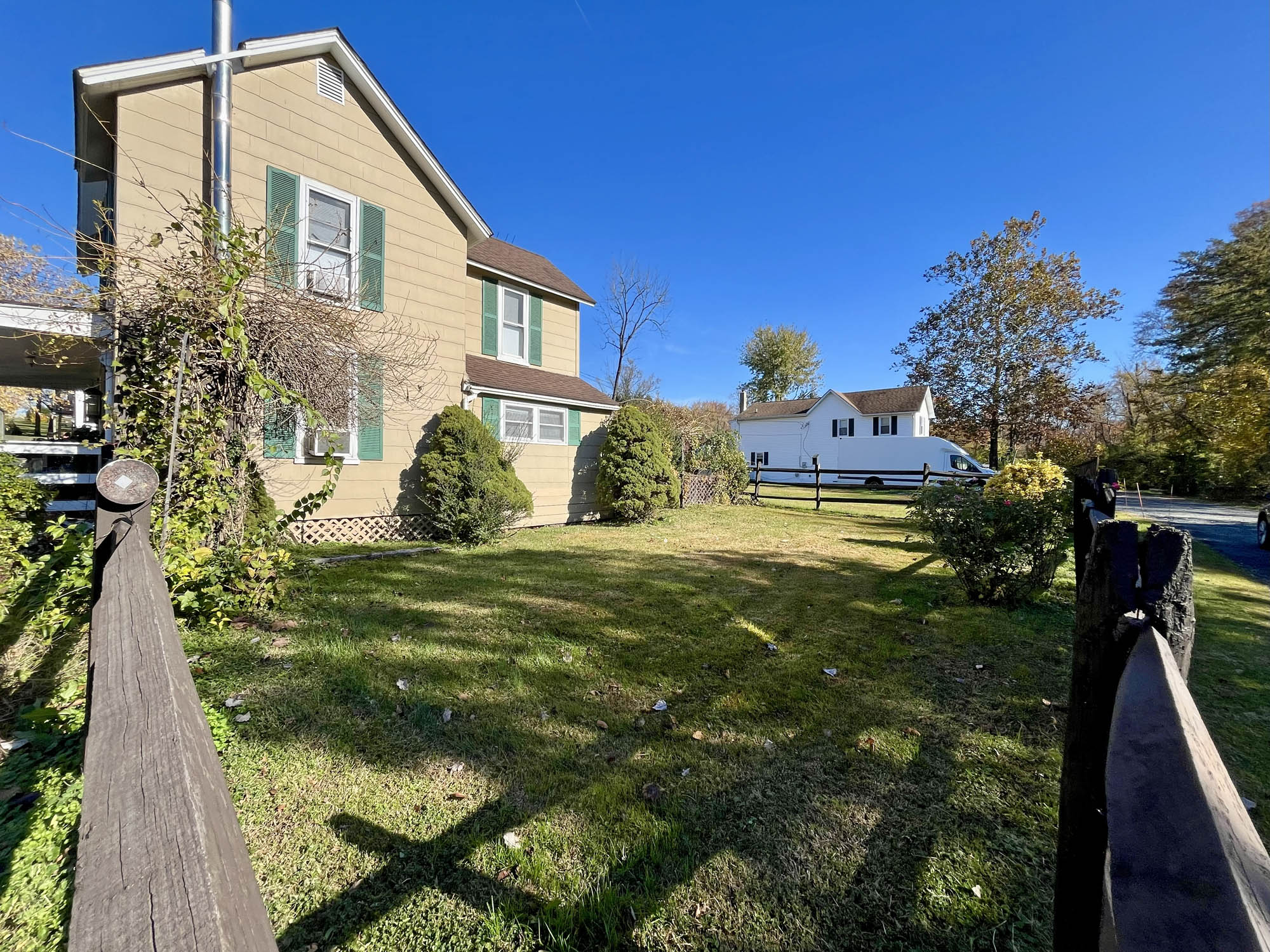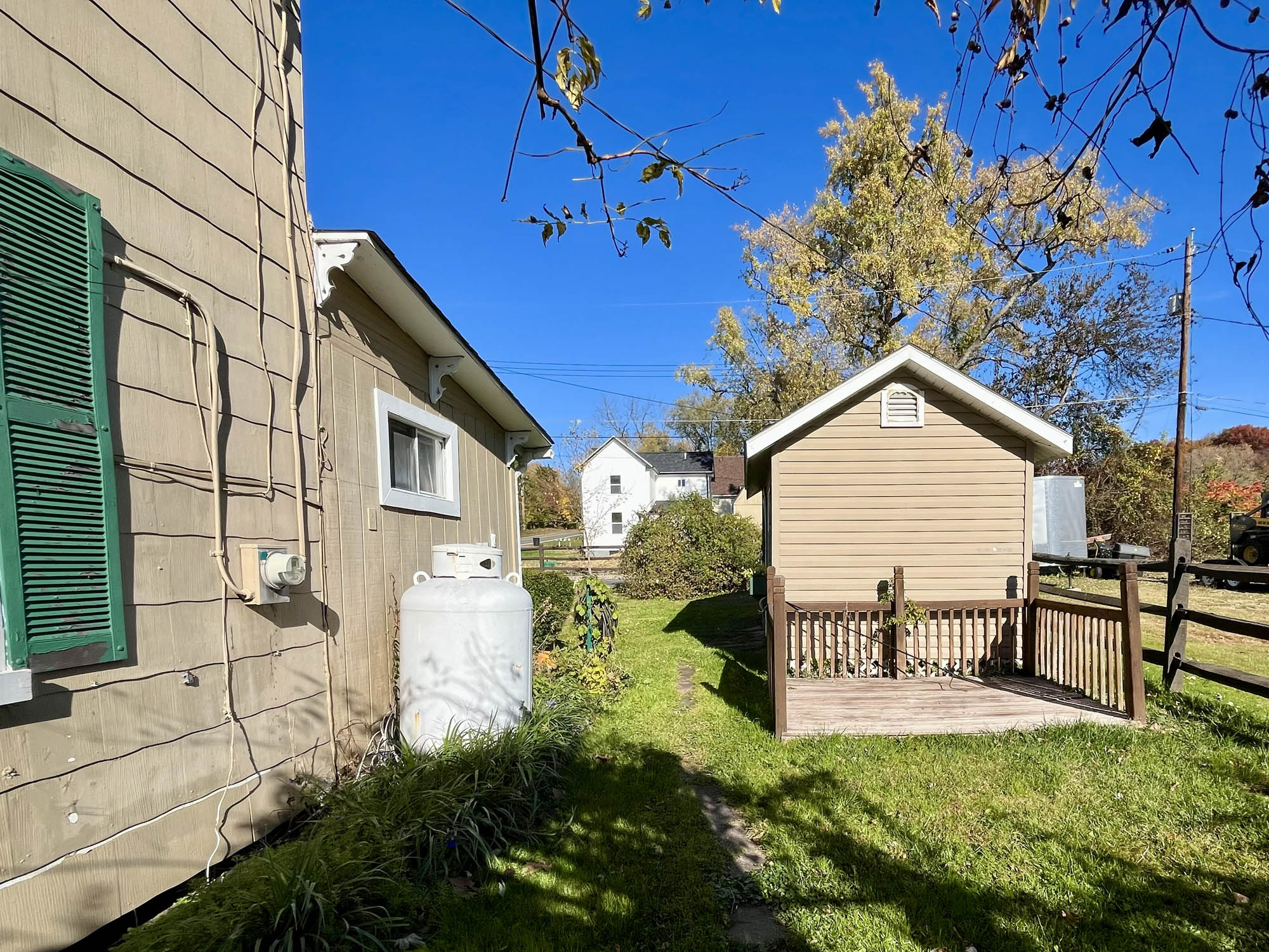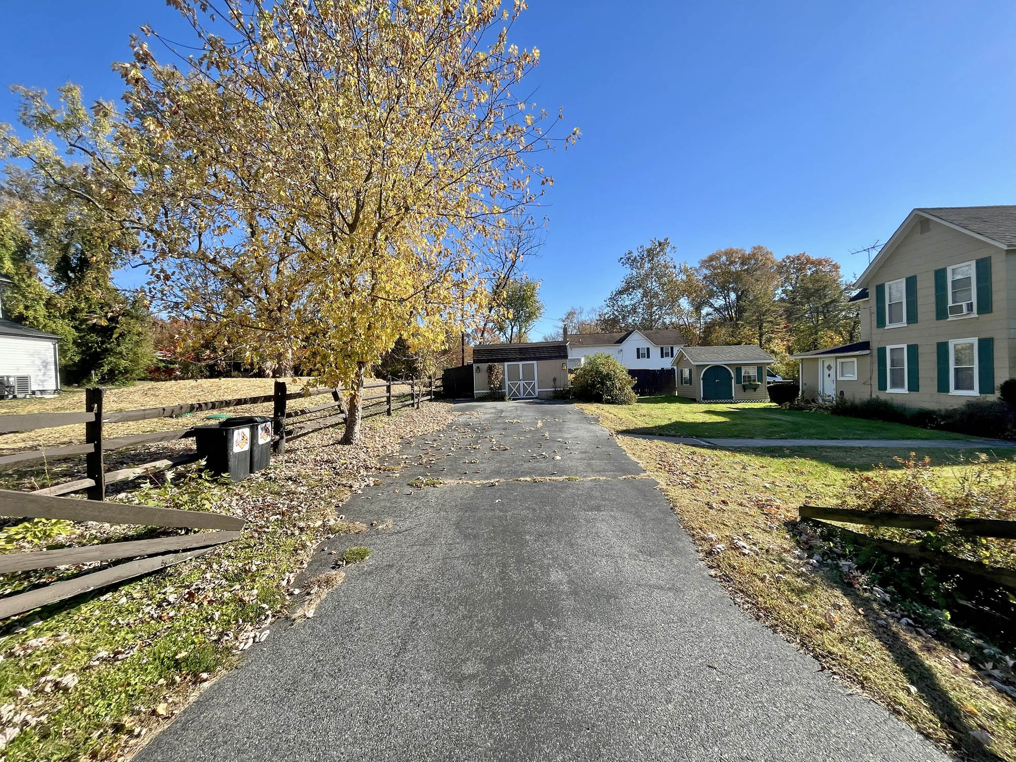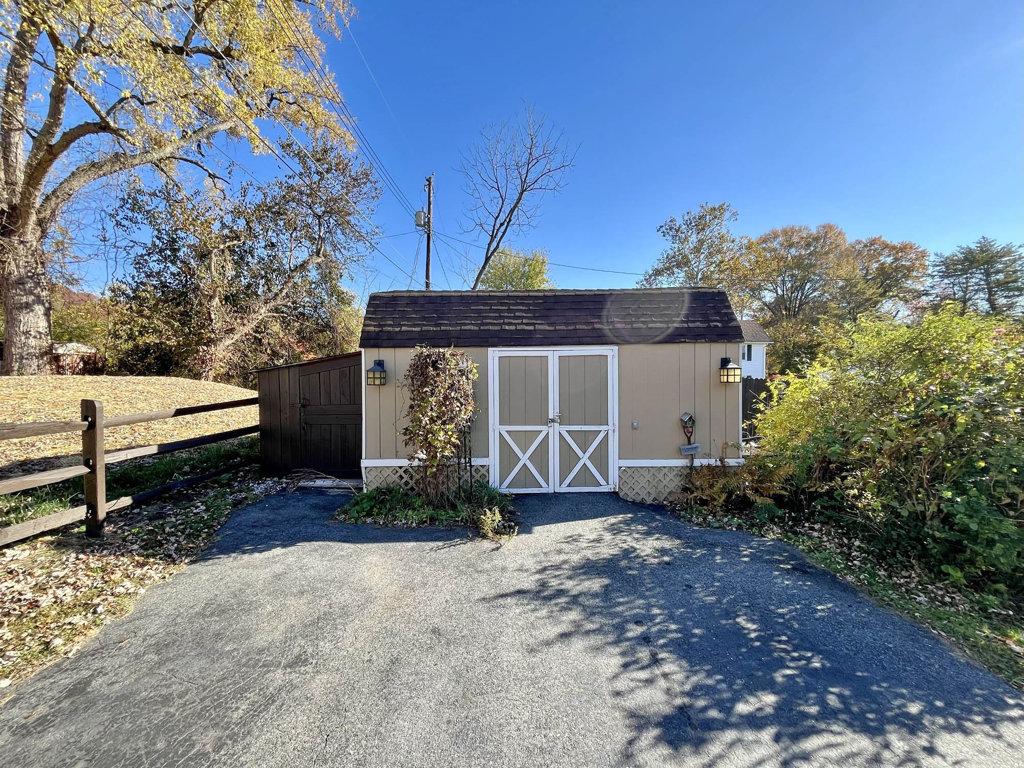 Level lot. Split rail fence. Mature landscaping. Macadam paved driveway and parking area for 3-4 vehicles. Storage shed and workshop/hobby building.