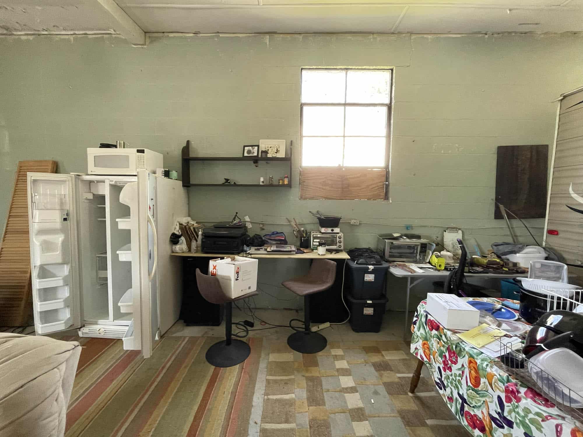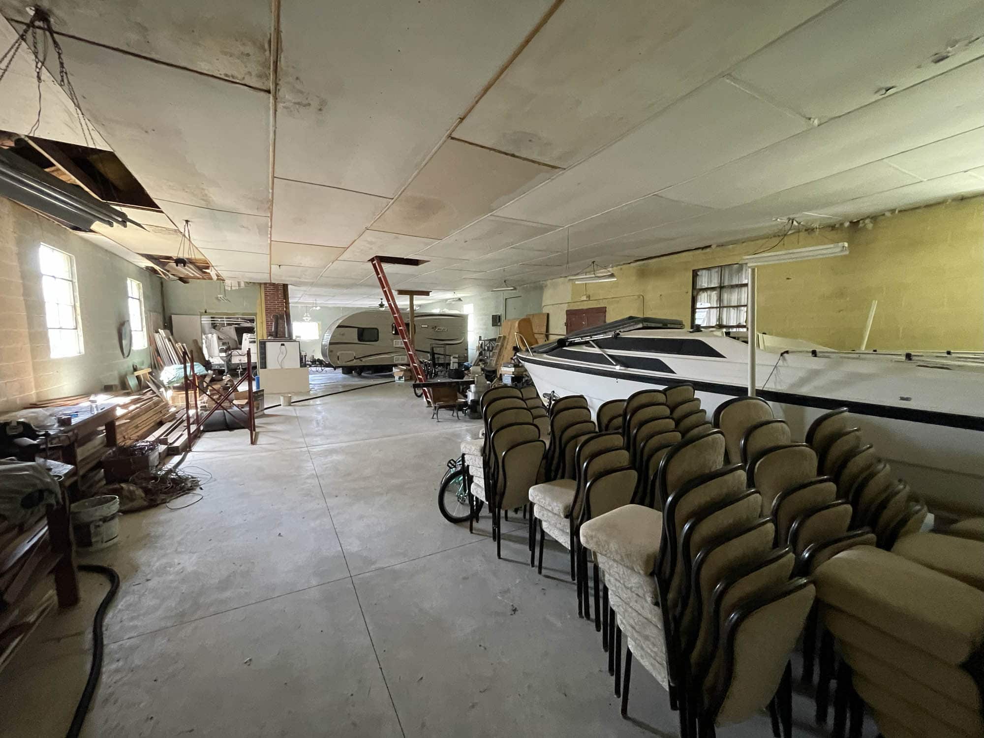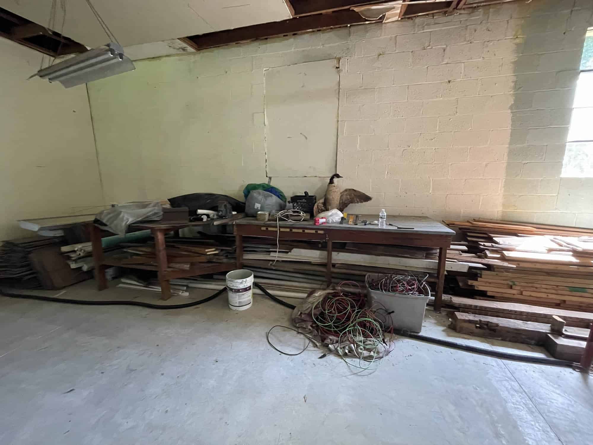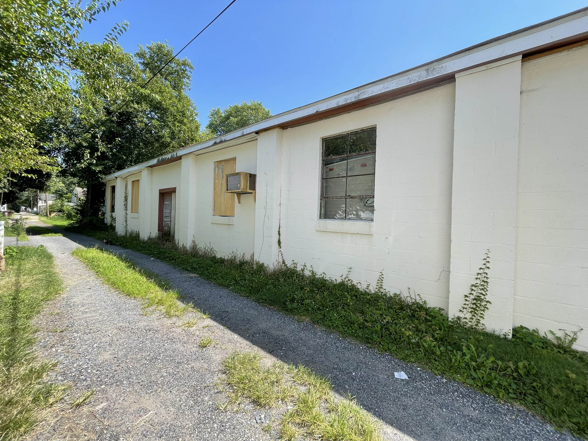 Single story masonry building – constructed in 1935 and containing 3,312 square feet of gross building area, according to public tax records. The building features a roll-up door, asphalt shingle roof, concrete floor, mixed windows, 200 amp electrical service and oil forced air furnace (condition unknown). Currently arranged as a warehouse or storage facility with mezzanine and powder room.