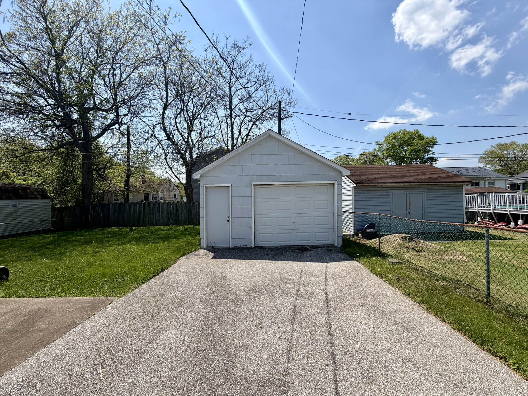 Asphalt driveway for 3-4 vehicles leads to detached one car garage (has power)