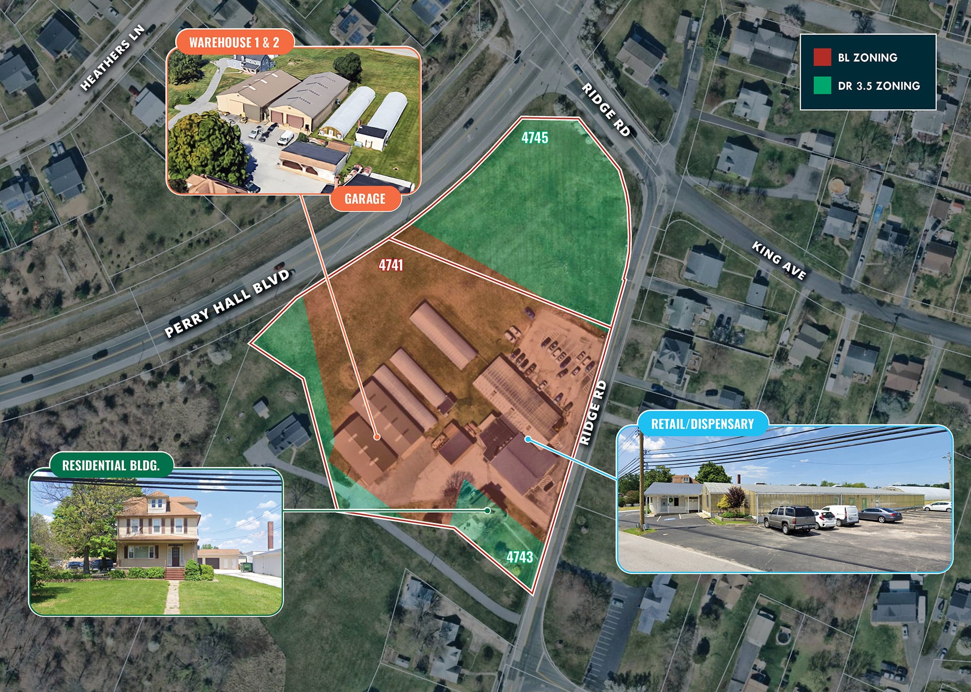 4743 & 4745 Ridge Road comprise a 4.14 acre mixed-use property in eastern Baltimore County between White Marsh and Rossville. The property features predominantly BL zoning, tenant occupied retail storefront, two warehouses (one tenant occupied), four greenhouses, single family home, large garage and ample parking. The property was the one time home of Seifert’s Florist, Inc., one of the area’s largest purveyors of poinsettias, and has since been repurposed for use as an investment property. Current tenants include Health for Life Cannabis Dispensary and Lilley Construction Company, providing a total of $110,000 per year in gross annual income at approximately 50% occupancy. The property is well situated for purchasers looking for a value-add investment or owner-occupants looking to buy a new home for their business. The auction offers an exciting opportunity to acquire an asset with existing income and ample potential.
