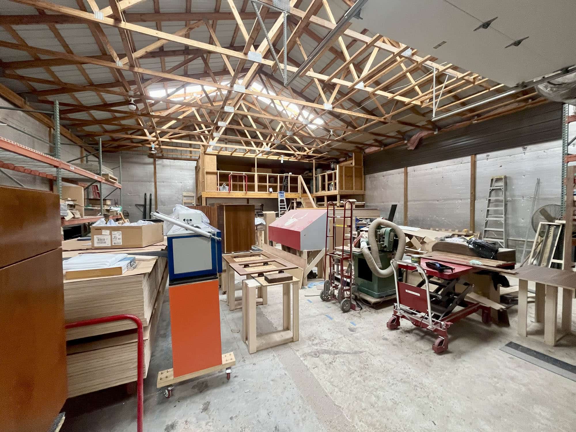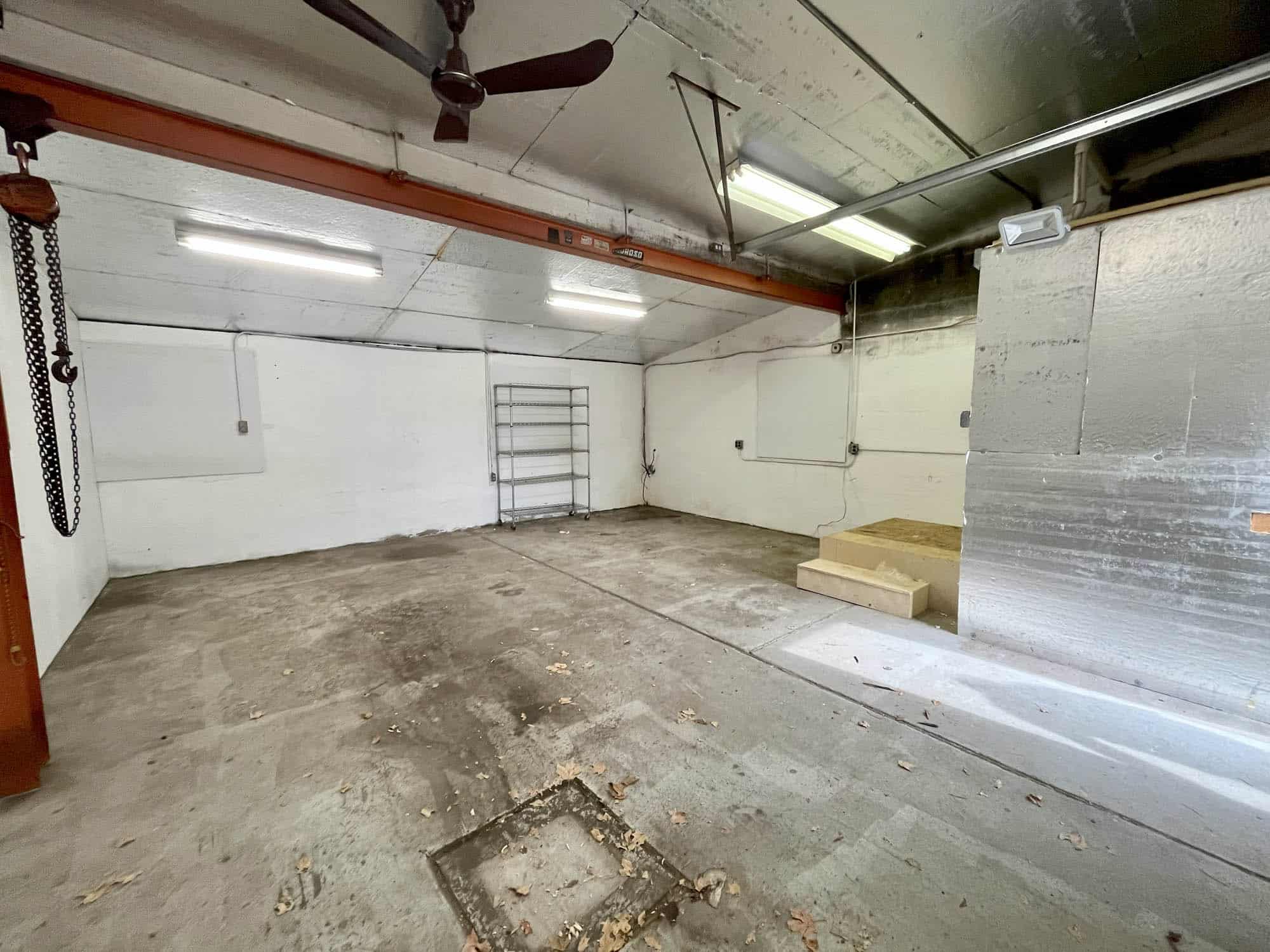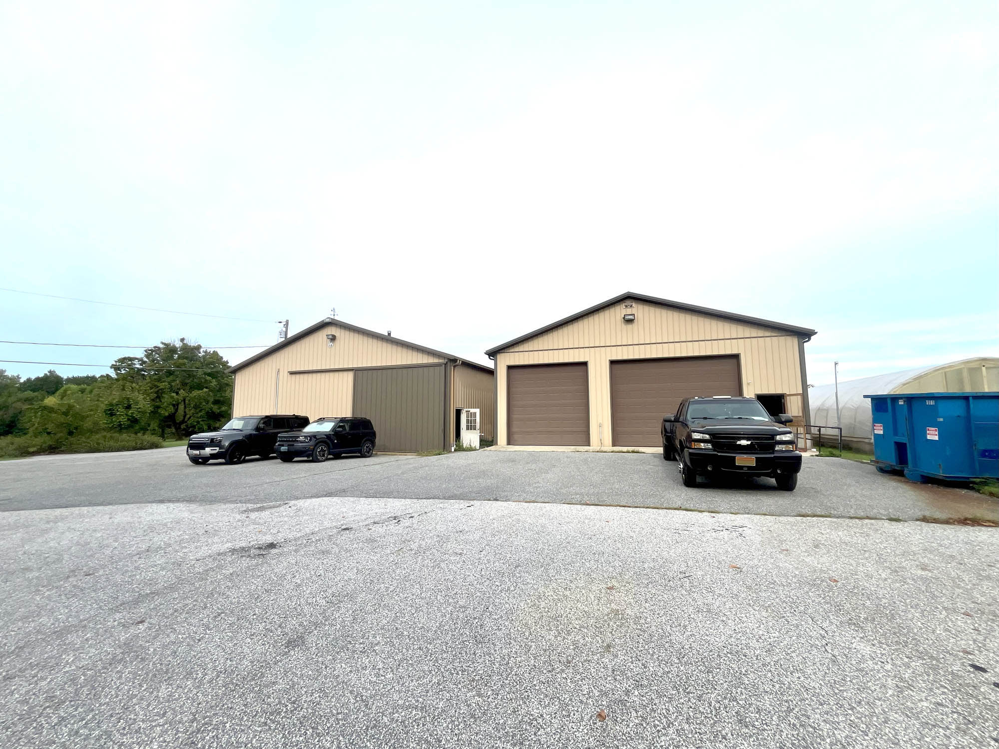 Frame warehouse building with corrugated metal siding and roof containing approximately 4,000 square feet of gross building area plus small mezzanine area. Oversized roll-up doors for drive-in loading. Arranged as front fabrication area and rear fabrication and storage area. Forced air heat (2 systems) and CAC. Skylights. Currently one electric meter for both warehouses. Shared powder room in garage building detailed below. Occupied by Lilley Construction with lease details in due diligence information.
