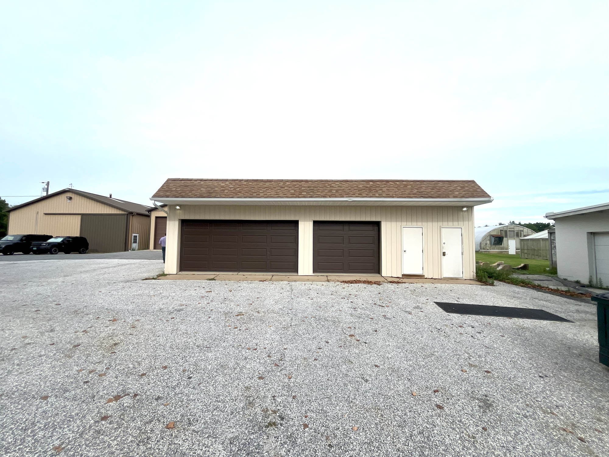 Garage building containing approximately 1,000 square feet of gross building area. Exterior features include vinyl siding, rubberoid roof, 2 roll-up doors, concrete floors, keypad entrance to powder room. Interior arranged as garage, powder room and rough-ins for second powder room/bath.