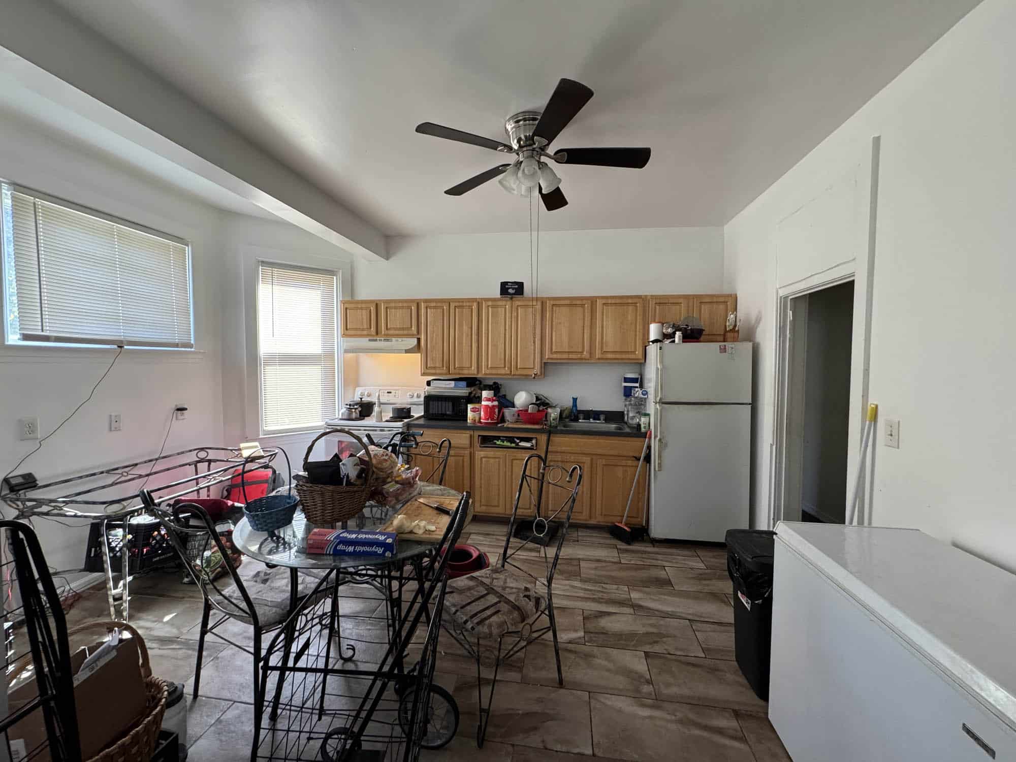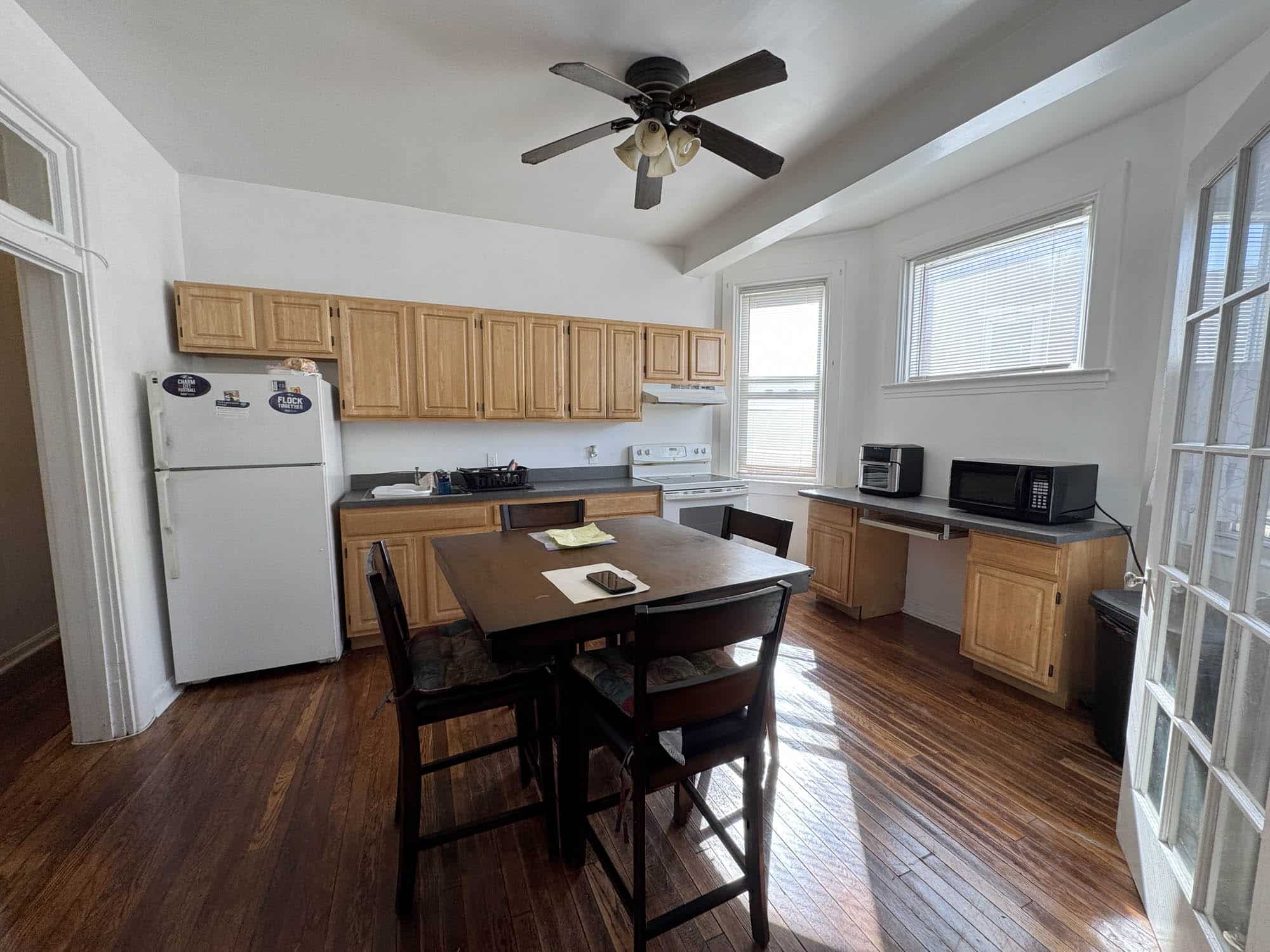 • Large kitchen – hardwood flooring, french door entrance to living room, wood cabinets, electric range and oven, laminate counter top, ceiling fan, dining space